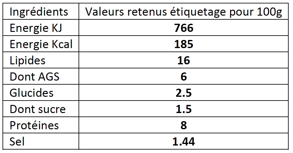 4 saucisses de porc français (45.71%), tomates (44.28%), eau, oignons, sel, cumin, poivre, muscade, piment de cayenne, sucre, GLUTEN : Farine de blé.